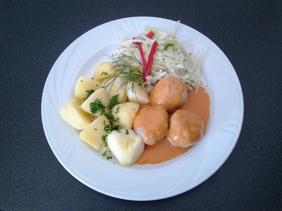 Pulpeciki wieprzowe w sosie pomidorowym, ziemniaki, surówka