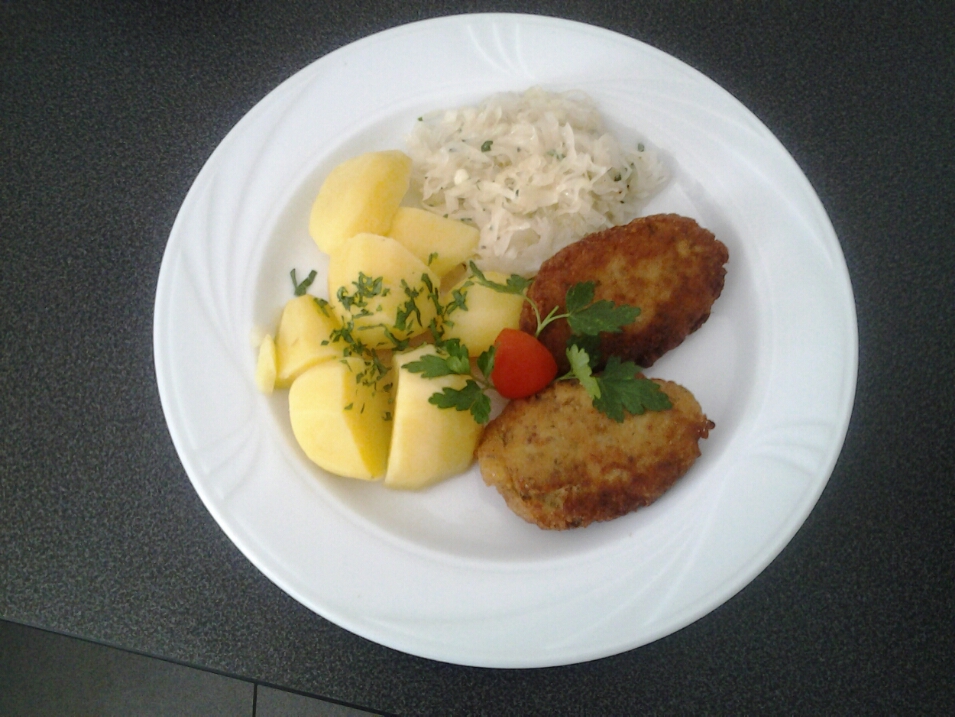 Kotleciki rybne, ziemniaki surówka w cenie 23,00zł, z zupą 30,00zł