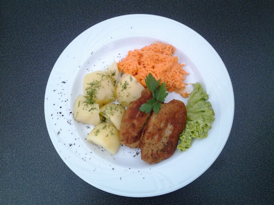 Kotleciki pożarskie, ziemniaki, marchewka zasmażana