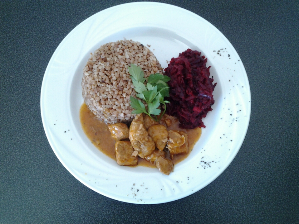 Gulasz wieprzowy, ziemniaki, surówka