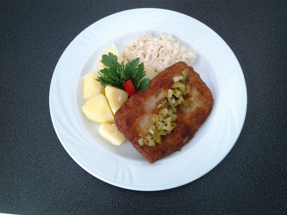 Sznycel wieprzowy" górski", ziemniaki, surówka